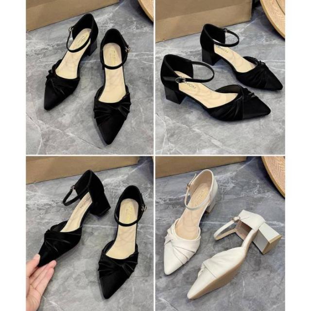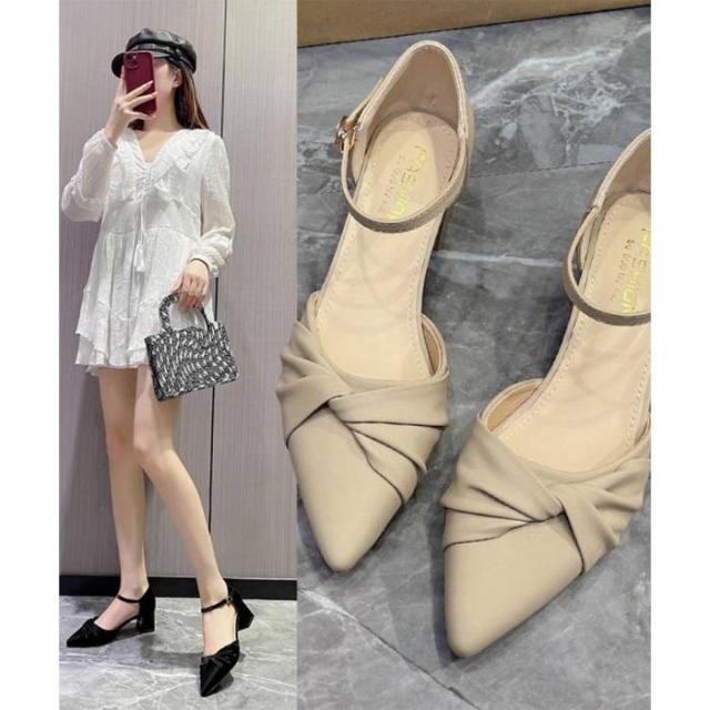 アッパーのねじれデザインが特徴的、シンプルながらもおしゃれなレディースセパレートパンプス 細めの足首ストラップで足元を華奢見せ、歩いても走っても脱げにくいから安定感抜群