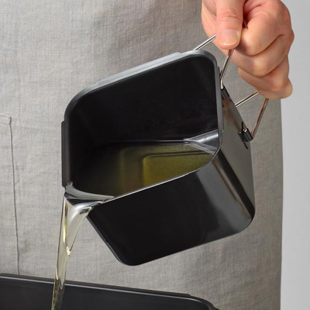 揚げ物に使用した油をスマートに保管。漉しアミで不純物を取り除き、蓋をして酸化を防げます。角があるから注ぎやすく、炒め物などの調理時に油を再利用できます。ふっ素樹脂加工だから、ベタベタ、ギトギトする油のお手入れもスッキリ洗浄できます。