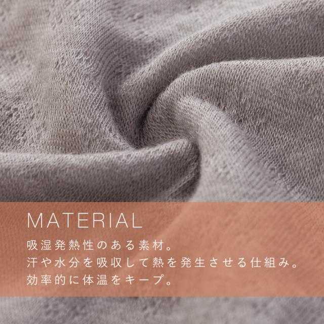 肌側は、天然繊維の綿100%。肌触り優しく、吸湿発熱繊維が直接当たらないので、化学繊維が苦手な方にもおすすめ。