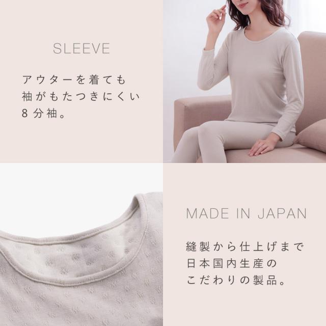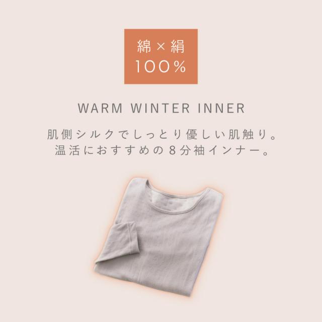 肌側シルク100%でしっとり優しい肌触り、8分袖インナー。
