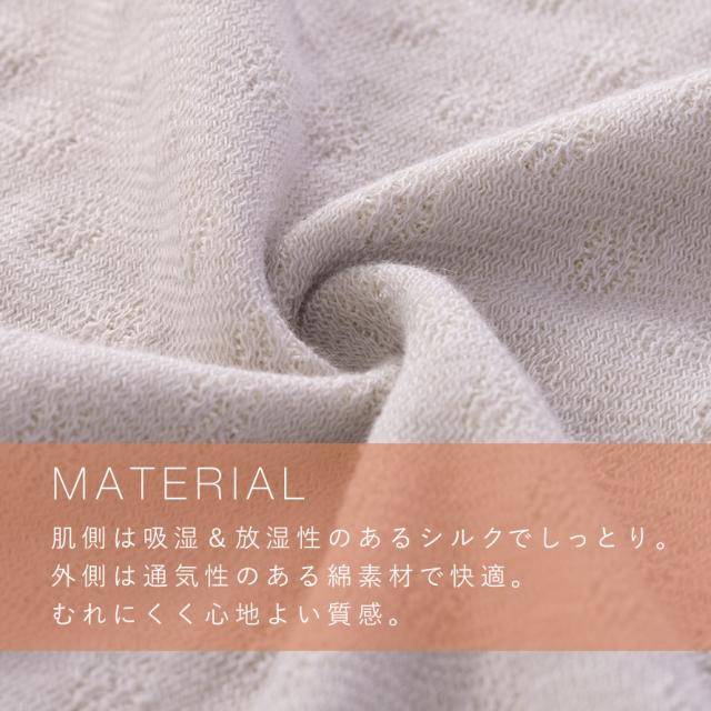 高い吸湿性と放湿性。汗を吸収しやすく乾きやすいため、肌をさらっとした状態にして、夏は涼しく冬は温かさを保ちます。しっとりとした肌触りで心地よい質感。敏感肌の方にもおすすめです。