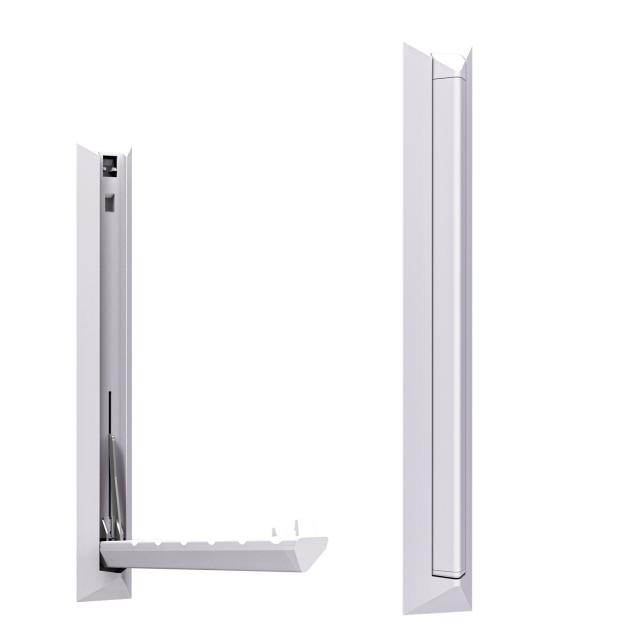 ”特長:”石膏ボード壁に取付けられる壁面物干し。使わないときはアーム部分をスッキリ収納。