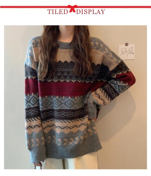 | 秋冬コーデに欠かせないレトロのニットセーター 着るだけで映えるおすすめのトップスです。 薄すぎず、厚すぎない程良い生地感で、ゆったりと着やすいオーバーサイズな作りになっています。 寒い季節に映えるノルディック調デザインで大人可愛さをプラス。定番柄をアップデートしたクルーネックセーターは今季推しアイテムです。 シンプルなデザインなので、20代、30代、40代、50代と幅広い年代の方にお使いいただけます。 | |