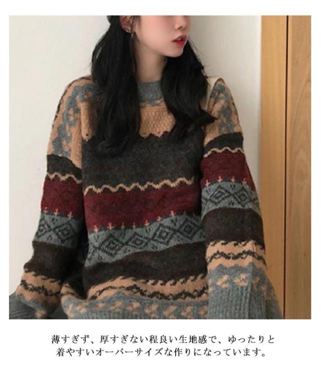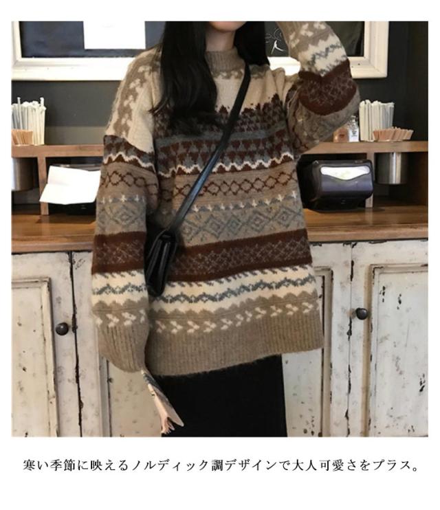 プルオーバー セーター 秋冬 ニット あったか 長袖 ノルディック柄 ニットセーター レディース おしゃれ 重ね着 プルオーバーセーター トップス 可愛い フリーサイズ 体型カバー 20代 30代 厚手 秋冬 クルーネック 暖かい クリスマス ギフト プレゼント 送料無料