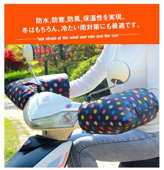 | 取付簡単な防寒・防風・防水ハンドルカバー 防水,防寒,防風,保温性を実現。冬はもちろん、冷たい雨対策にも最適です。 内側は保温性抜群です。カバー表面の防水加工も施してありますので雨や雪の日でも安心です。男女兼用。 伸縮性があるから、サイズを調節可能です 仕事に、通勤に、通学に、毎日バイクに乗る人のための冬の寒さ対策。バイク、ミニバイクに適応 | |