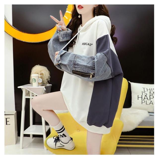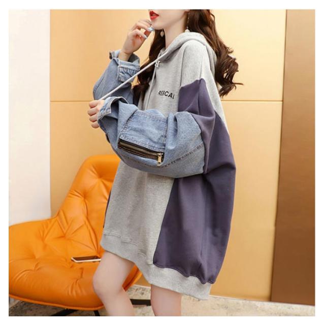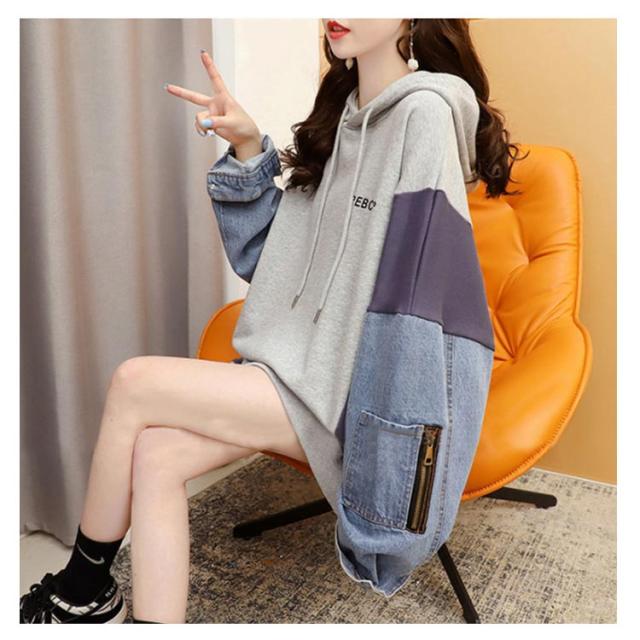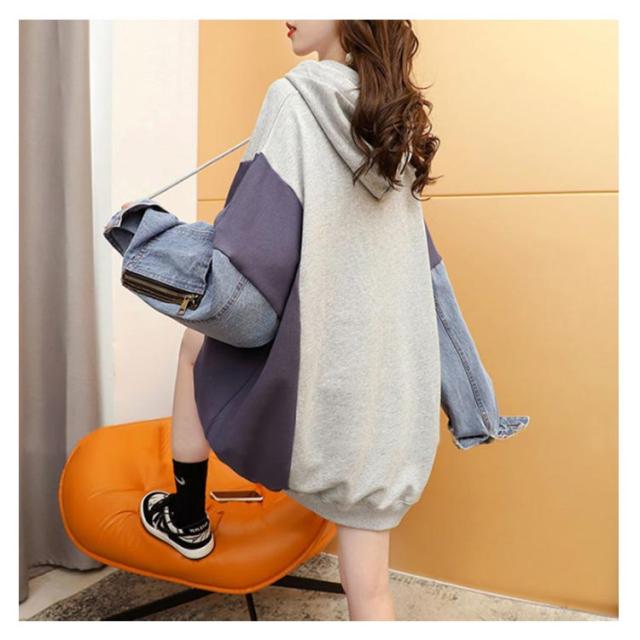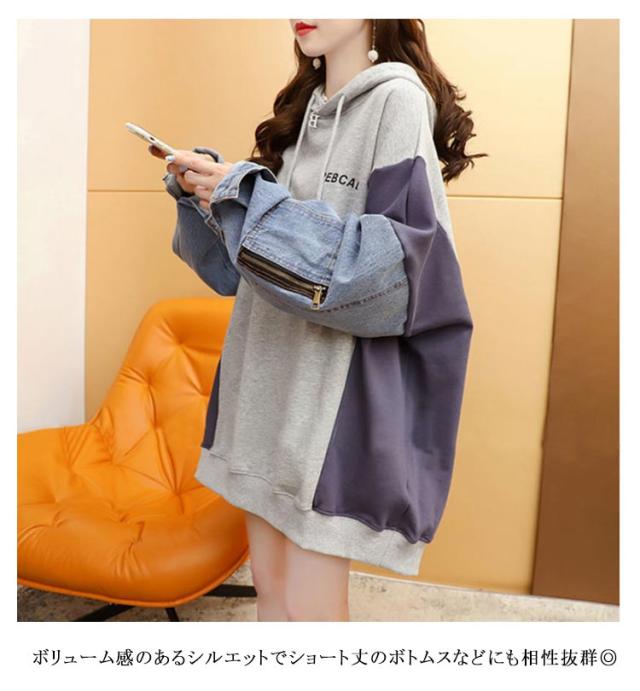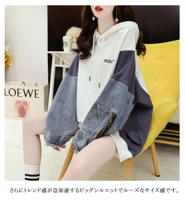 デニム切り替え デニム切り替え 体型カバー パーカー レイヤード デニム ビッグシルエット デニムパーカー レディース フードパーカー ドッキング ゆったり パーカー 春 秋 冬 お洒落 可愛い