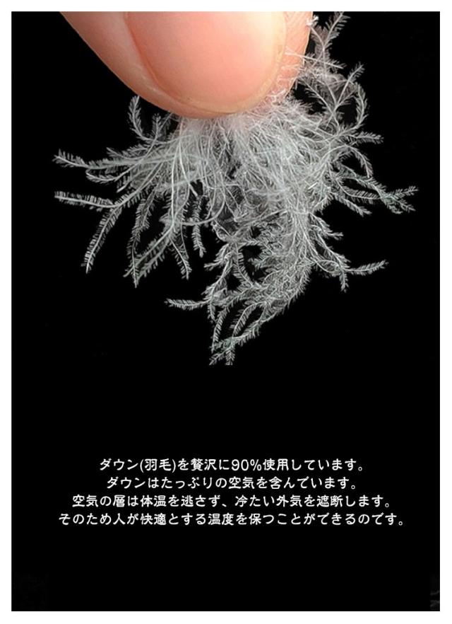 | 素材 | 表地:ポリエステル 裏地:ポリエステル 中身:90%ダウン・10%フェザー |