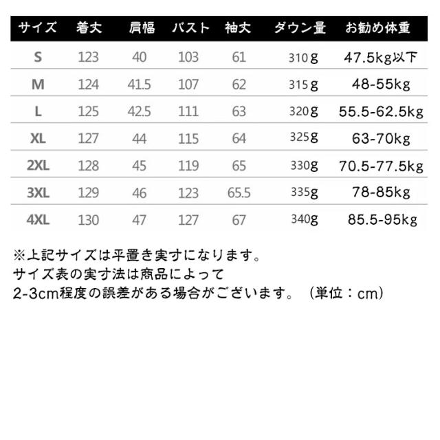 | ダウンをたっぷり90%! S-4XL 超ロング丈ダウンコート ダウン(羽毛)を贅沢に90%使用しています。 ダウンはたっぷりの空気を含んでいます。 空気の層は体温を逃さず、冷たい外気を遮断します。そのため人が快適とする温度を保つことができるのです。 取り外し可能な帽子に紐付きで、調整できます♪ ポケット裏地はもこもこ生地、中まで暖かいです。 左右にある各4つスナップボタン スナップボタンでアレンジできるスリットスりで脚さばきも楽々 防風袖口・風の吹き込みを防ぐ袖口♪ 冬の寒さを和らげるように首元を暖めるデザイン。 ボタンを閉めると、ふっくらした襟元で首周りと包みこんでくれます♪ | |