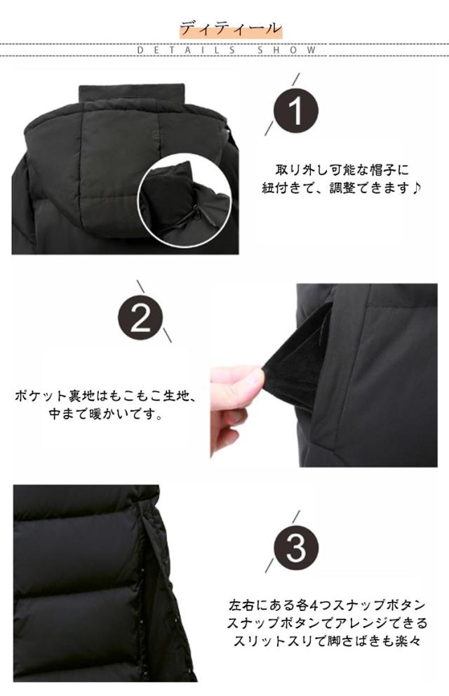 | ダウンをたっぷり90%! S-4XL 超ロング丈ダウンコート ダウン(羽毛)を贅沢に90%使用しています。 ダウンはたっぷりの空気を含んでいます。 空気の層は体温を逃さず、冷たい外気を遮断します。そのため人が快適とする温度を保つことができるのです。 取り外し可能な帽子に紐付きで、調整できます♪ ポケット裏地はもこもこ生地、中まで暖かいです。 左右にある各4つスナップボタン スナップボタンでアレンジできるスリットスりで脚さばきも楽々 防風袖口・風の吹き込みを防ぐ袖口♪ 冬の寒さを和らげるように首元を暖めるデザイン。 ボタンを閉めると、ふっくらした襟元で首周りと包みこんでくれます♪ | |