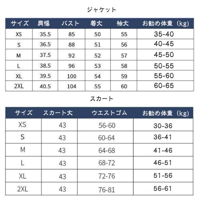 | サイズについての説明 | 【セット内容】ジャケット/長袖シャツ/スカート/リボンorネクタイ/ 【ご注意】:スーツは型番に合わせてコーディネートしますので、自分の 好みに合わせたものを選んでみてください。 ※総柄リボンの色は、カラーによって異なります。 ※上記サイズは平置き実寸になります。 サイズ表の実寸法は商品によって2-3cm程度の誤差がある場合がございます。(単位:cm) |