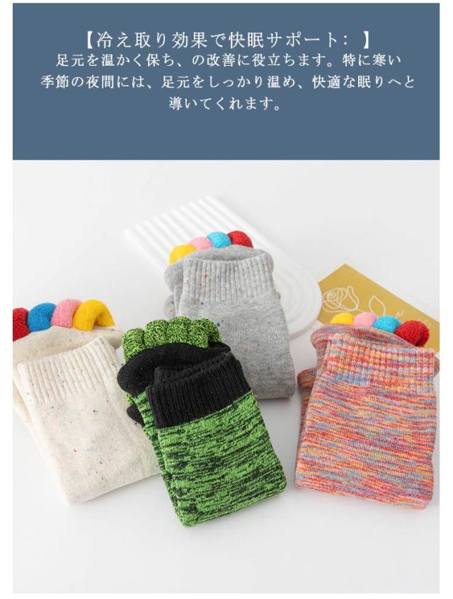 | 【5本指デザインで足指を広げる効果:】 特殊な5本指デザインが、足指を自然に大きく広げ、筋肉をほぐし、血行を促進します。毎日の使用で、足の疲れを取り除き、リフレッシュ感を得られます。【外反母趾の予防と矯正に効果的: 】足指を個別にサポートすることで、外反母趾の進行を抑え、矯正効果が期待できます。自然な形で足指を広げるので、無理なく足の形を整えます。 【マッサージ効果でリラクゼーション: 】足指の間隔を広げることで、足裏のツボを刺激し、軽いマッサージ効果を発揮。日中の疲れやストレスを軽減し、心身ともにリラックスできます。 【高い通気性と柔らかな素材: 】ふわふわのパイル生地を使用しており、長時間履いても蒸れにくく、快適な着用感を維持。通気性が高く、汗をかきやすい方にもおすすめです。 【優れた伸縮性と快適なフィット感:】 伸縮性の高い素材と太めのリブが、足の形にぴったりフィットしながらも、締め付け感がなく快適な履き心地を提供します。動きやすさを妨げず、日常使いに最適です。 【冷え取り効果で快眠サポート: 】足元を温かく保ち、の改善に役立ちます。特に寒い季節の夜間には、足元をしっかり温め、快適な眠りへと導いてくれます。 | |