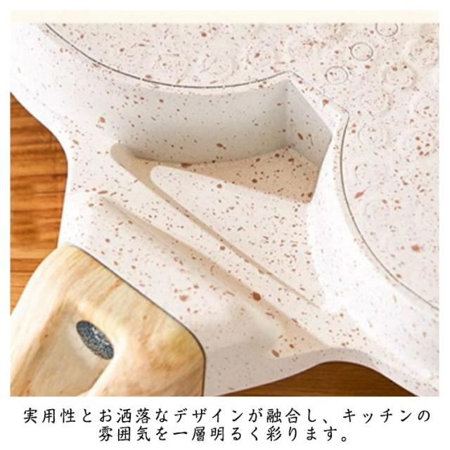 | ご家庭からレストランまで様々な場面で大活躍するフライパンです。 仕切りにより、目玉焼き、ソーセージ、パンケーキ、今川焼きなどを綺麗に仕上げます。 軽量設計なので、料理時もお手入れ時も非常に使いやすく、手への負担が少ないです。 IHやガス火など、あらゆる熱源に対応しています。 焦げつきにくく、食材がくっつきにくいため、調理作業がスムーズに行えます。 調理後もスポンジで軽く拭くだけで、汚れもスルッと落ちます。 実用性とお洒落なデザインが融合し、キッチンの雰囲気を一層明るく彩ります。 | |