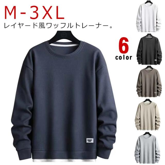プルオーバー 長袖Tシャツ ワッフル 無地 春 薄手 トレーナー カジュアル メンズ ルームウェア ワッフル ロンT トップス パジャマ 重ね着風 Tシャツ ロングTシャツ tシャツ おしゃれ 大きいサイズ クルーネック 春服 秋 秋服 ユニセックス 男女兼用