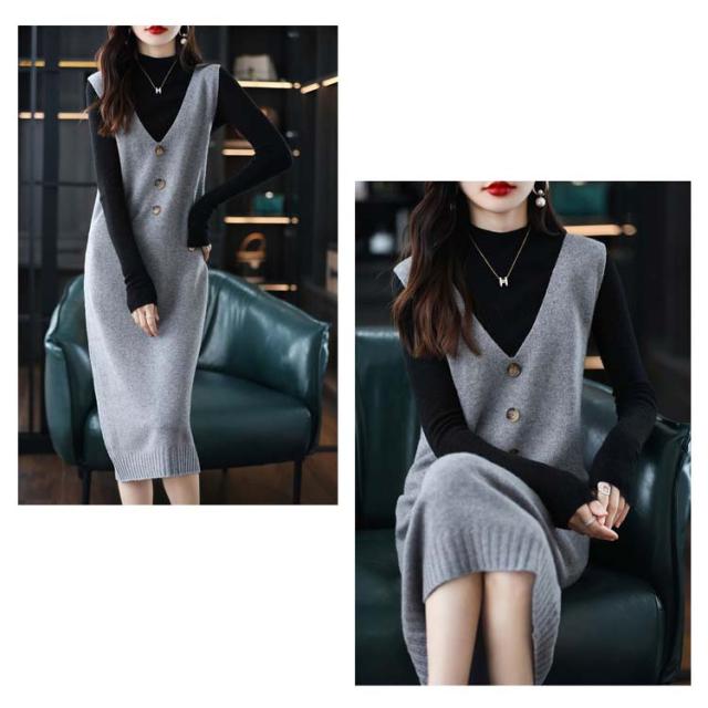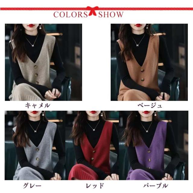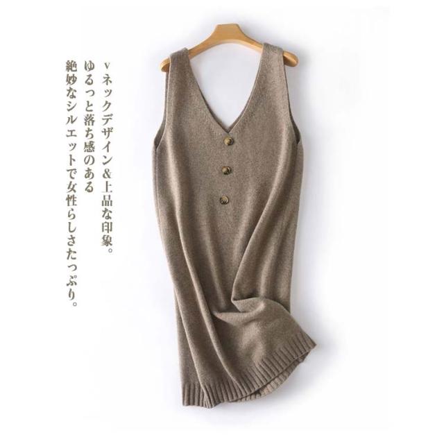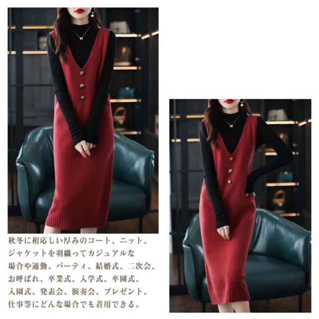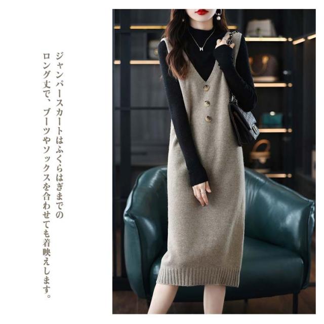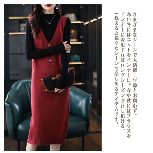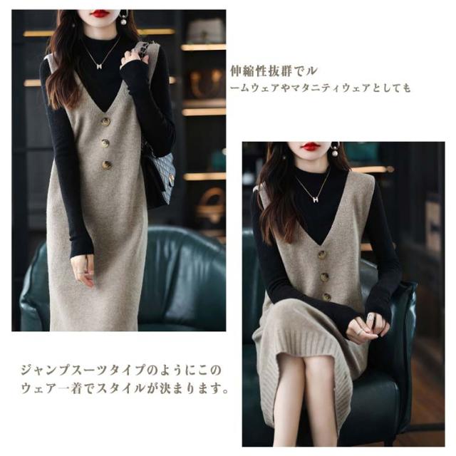 ニットワンピース レディース ロングワンピ Vネック ニット ジャンパースカート ニットワンピース ノースリーブ ロングベスト 膝丈 ニットベスト サロペット カジュアル 可愛い 重ね着 体型カバー 春 秋 冬