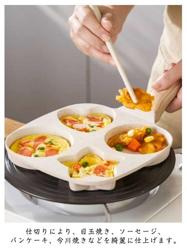 卵焼き器 仕切りパン 目玉焼き フライパン くっつきにくい 4つ穴 目玉焼き 木製ハンドル パンケーキ 洗いやすい 同時調理 お手入れが簡単 朝食 お弁当用 キッチン用品 調理器具 家庭用