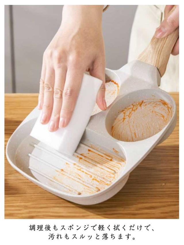 | ご家庭からレストランまで様々な場面で大活躍するフライパンです。 仕切りにより、目玉焼き、ソーセージ、パンケーキ、今川焼きなどを綺麗に仕上げます。 軽量設計なので、料理時もお手入れ時も非常に使いやすく、手への負担が少ないです。 IHやガス火など、あらゆる熱源に対応しています。 焦げつきにくく、食材がくっつきにくいため、調理作業がスムーズに行えます。 調理後もスポンジで軽く拭くだけで、汚れもスルッと落ちます。 実用性とお洒落なデザインが融合し、キッチンの雰囲気を一層明るく彩ります。 | |