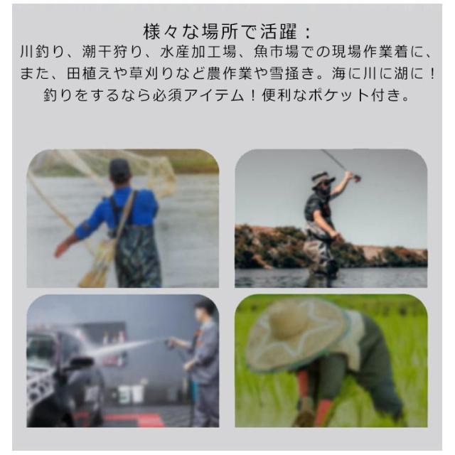 | 透湿防水素材であるPVCを採用した漁業作業や掃除や釣りなどにピッタリなサロペットです。 溶着強度に優れた生地は大変丈夫なため、耐寒性・耐摩擦性・耐剥離性を備え、厳しい作業環境に耐えることができます。 PVC加工で防水性・撥水性の高い生地が使われており、水に濡れないのはもちろんですが、水温で奪われる体温の低下スピードを遅くします。 足から胸までを覆う部分に防水性・撥水性の高い生地が使われており、履くだけで体が濡れるのをしっかり防ぐことができます。 ブーツとズボンは縫い合わせるのではなく、一体化でつくられており、水漏れはしません。通気性もよいこの胴長ウェーダーをはき、渓流に入っても体を乾燥的に保ちます。 防滑ソールを採用しており、バス釣りや防波堤には最適です。靴裏は厚底になっており踏みつけ怪我の防止になります。 様々な場所で活躍:川釣り、潮干狩り、水産加工場、魚市場での現場作業着に、また、田植えや草刈りなど農作業や雪掻き。 海に川に湖に!釣りをするなら必須アイテム!便利なポケット付き。 | |