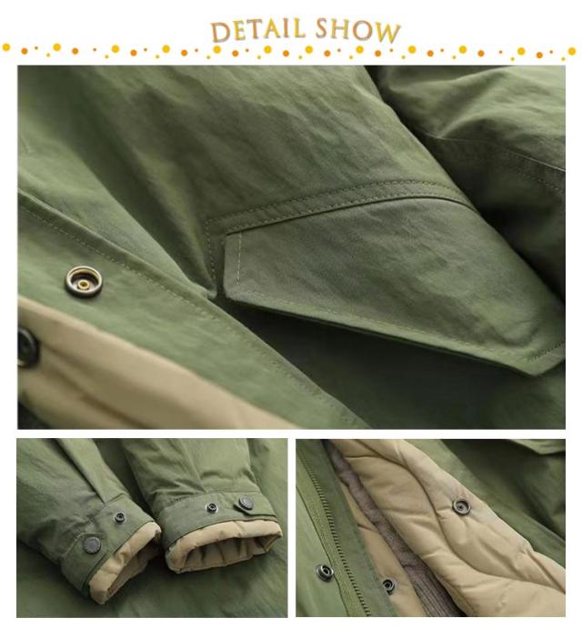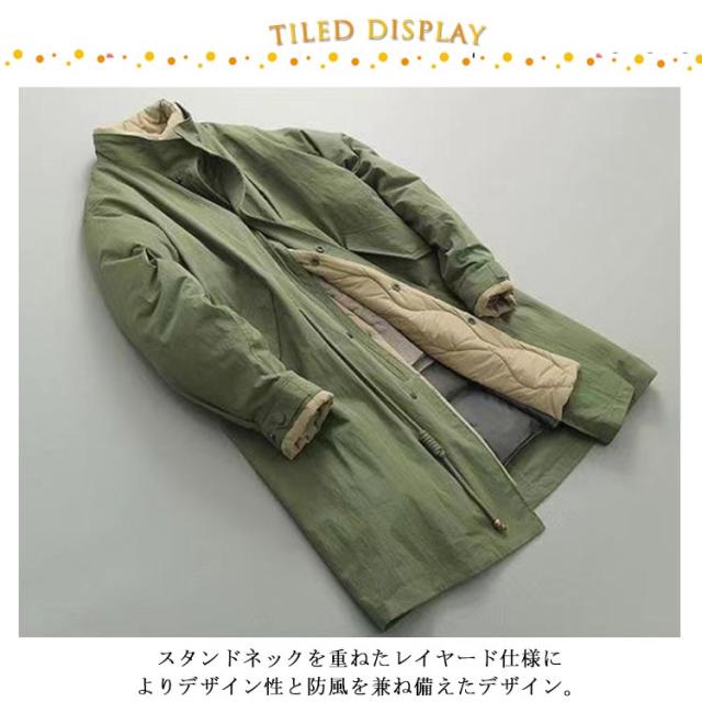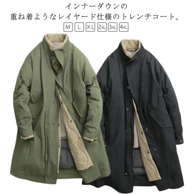 厚手 コート 暖かい 中綿 トレンチコート メンズ レイヤード仕様 ミドル丈 キルティングコート 中綿コート ミリタリーコート モッズコート スタンドネック 秋冬 アウター 配色 大きいサイズ トレンチコート 防寒 カジュアルコート 軽量 冬服 冬物 黒 カーキ