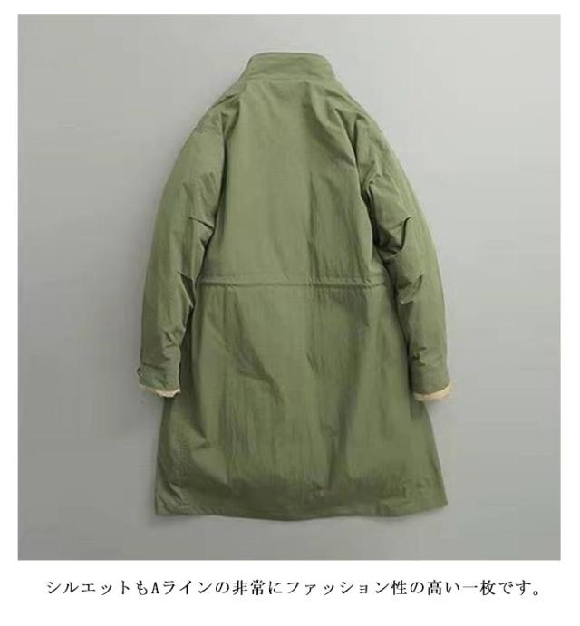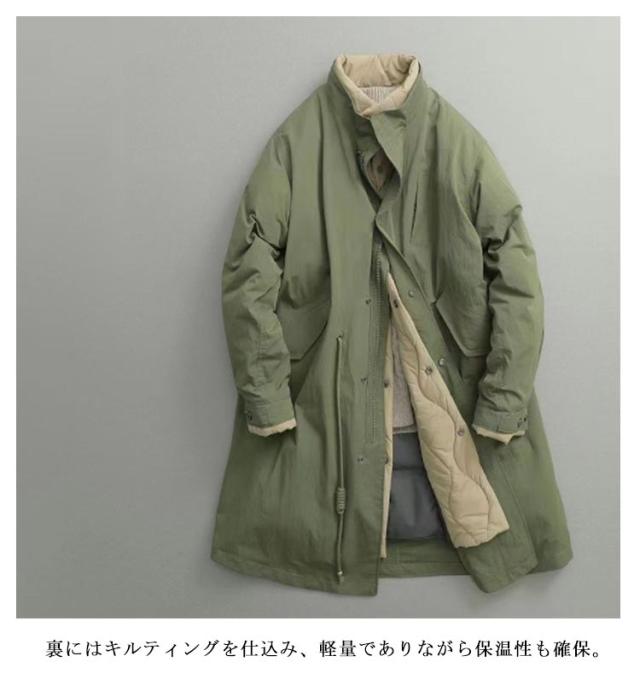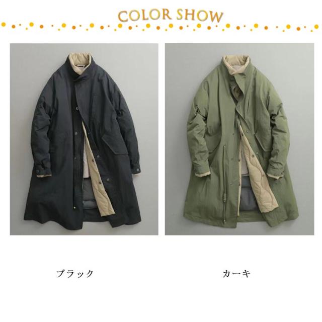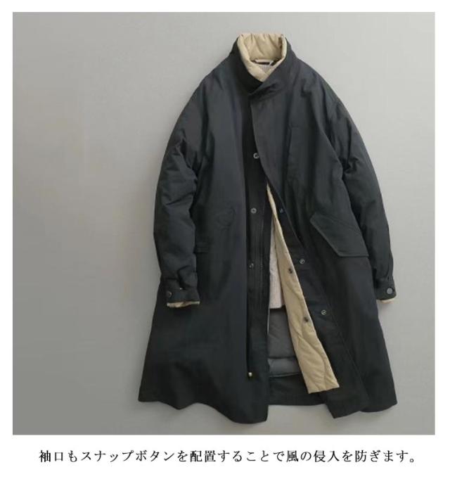 | インナーダウンの重ね着ようなレイヤード仕様のトレンチコート。 スタンドネックを重ねたレイヤード仕様によりデザイン性と防風を兼ね備えたデザイン。 袖口もスナップボタンを配置することで風の侵入を防ぎます。 裏にはキルティングを仕込み、軽量でありながら保温性も確保。 シンプルでありながら、スタイリッシュな印象を与えるフード付きのデザイン。 シルエットもAラインの非常にファッション性の高い一枚です。 オーバーサイズながらも、程よく身体を包み込む絶妙なサイズバランスに仕上げ、ビッグシルエットに苦手意識のある方にも取り入れやすくなっています。 ウエストのドローコードがシルエットを調整でき、リラックスしたフィット感を実現。 | |