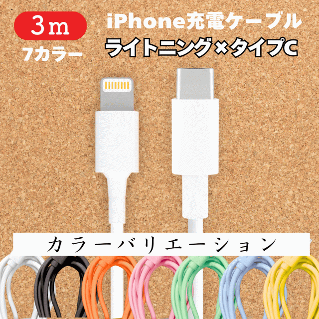 iPhone 充電 ケーブル iphone 3m 1本 ライトニング端子 タイプC端子 アイフォン 携帯充電器 7色 ホワイト ブラック オレンジ ピンク グリーン ブルー イエロー カラー