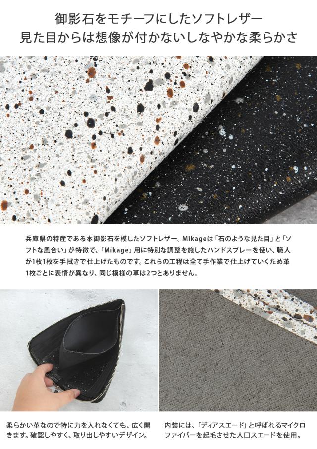 | まるで石のような見た目のスプレー加工がアクセントになったスマートな長財布 L字ファスナーのロングバージョンになります。スリムな見た目ながら大容量かつスマートな長財布で、見た目もスッキリ。 バッグの中に入れておく際にも邪魔になりにくいフォルムになっています。 内側の札入れのポケットにはマチを付けて、お札やレシートなどの見やすさと出し入れのしやすさを向上させました。カードも12枚収納可能で、薄マチながも収納力のある頼れる財布です。 【MIKAGE ミカゲ】 兵庫県の特産品である本御影石を模したレザーを使用する「MIKAGEシリーズ」。 この素材は「石のような見た目」と「手触りの良いソフトな風合い」が特徴です。 特別な調整を施したハンドスプレーを使い、職人が1枚1枚手拭きで仕上げています。手作業で仕上げていくため、同じ型、同じ色でも1点1点違う柄になり、ひとつとして同じものはありません。 また、塗料も落ちることなく使用することができます。さらに石のような見た目に反するソフトな革の質感もポイント。シンプルな作りで使い勝手も良く、プレゼントとしてもおすすめです。 |
