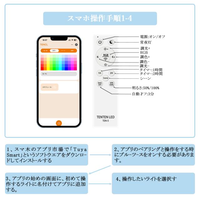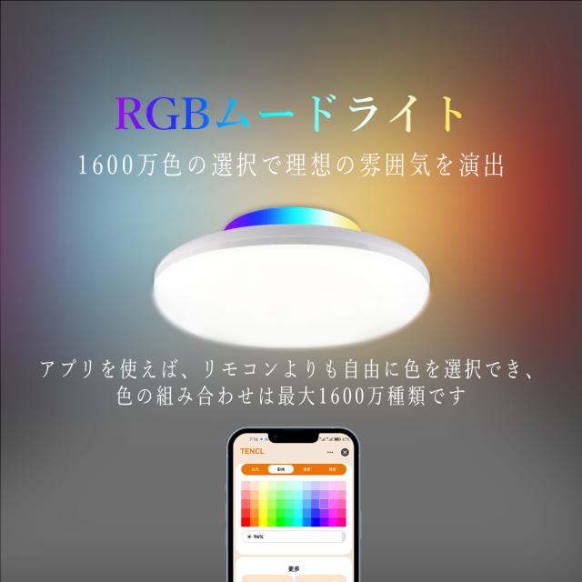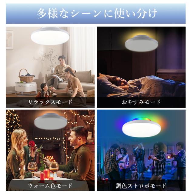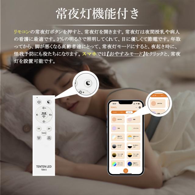 - 本製品は無段階調光&調色機能を搭載し、気分や季節によって、部屋の光量や背景色を一変!全方位制御できる便利なリモコンが付きます。また、指定のアプリをダウンロードして、スマホでも自由に操作可能です。常夜灯は夜間授乳や病人の看護に最適です。3%の明るさで照明してくれて、目に優しくて節電です。