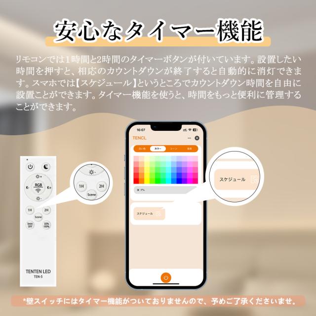 - リモコンでは1時間と2時間のタイマーボタンが付いています。設置したい時間を押すと、相応のカウントダウンが終了すると自動的に消灯できます。スマホでは【スケジュール】というところでカウントダウン時間を自由に設置ことができます。