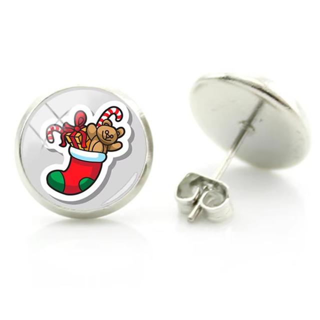 靴下いっぱいに詰められたクリスマスプレゼントをデザインしたカボションをスタッドピアスにセットしたオシャレなファッションピアス。