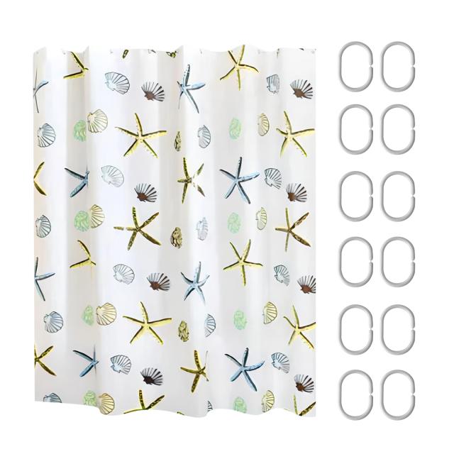 シャワーカーテン 防水防カビ加工 カーテンリング付属 シャワールーム用カーテン 浴室カーテン ヒトデ 貝殻 海星 柄 間仕切り バスルーム バスタブ リング付属 お風呂場 目隠し 180×200cm(ホワイト)