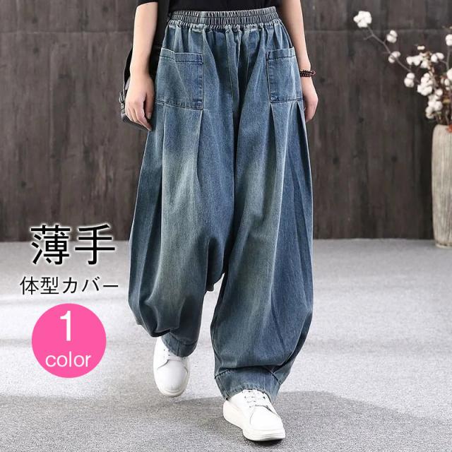 サルエルパンツ デニムパンツ コクーンデニム サーカスパンツ パッチワーク ウエストゴム アンクル丈 ワイドパンツ お洒落 ワイド ゆったり バルーン