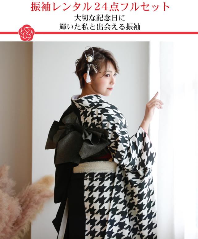 最大20日間レンタル 振袖 レンタル 成人式 黒 着物 黒地に千鳥格子振袖24点フルセットレンタル 無地 シンプル モノトーン モード 1月 振り袖 モダン レトロ かっこいい