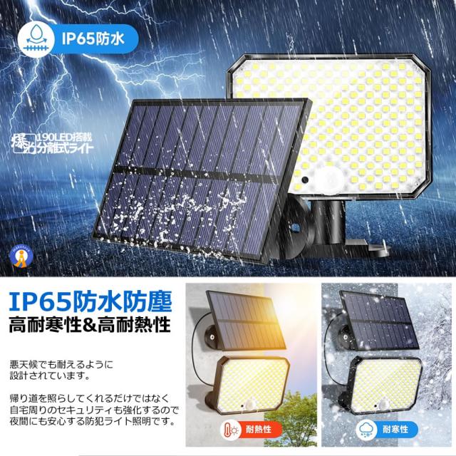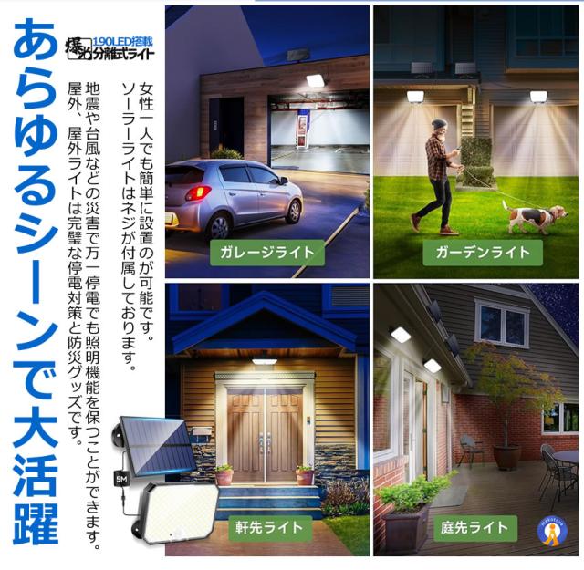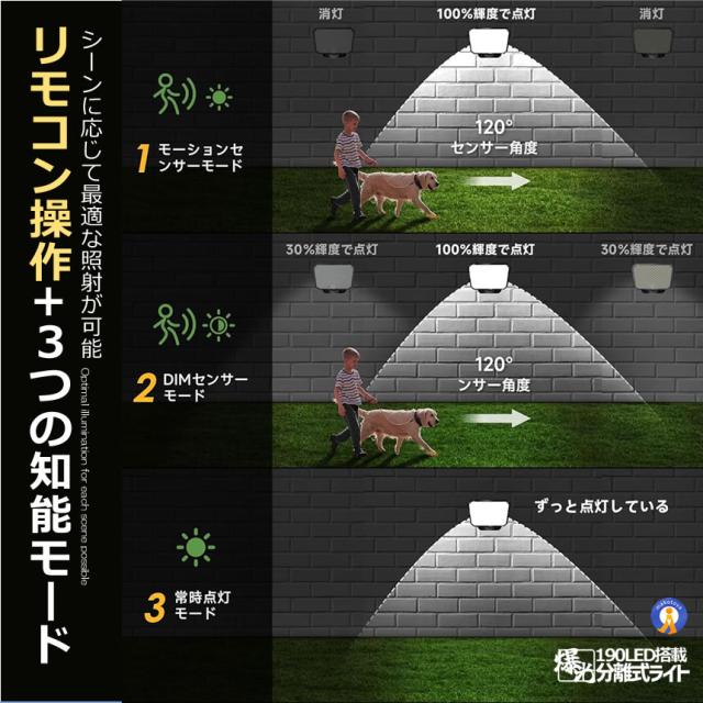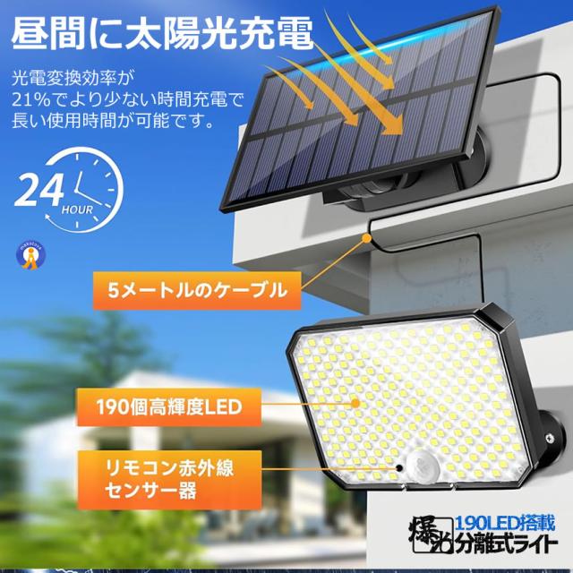190LED センサーライト 分離式 ソーラー 人感 リモコン 遠隔 3つのモード 照明 広角 防水 作業灯 ソーラーパネル ガーデン 庭 ウッドデッキ LED投光器 太陽光充電 電気代不要 自動点灯 190LEDRAI