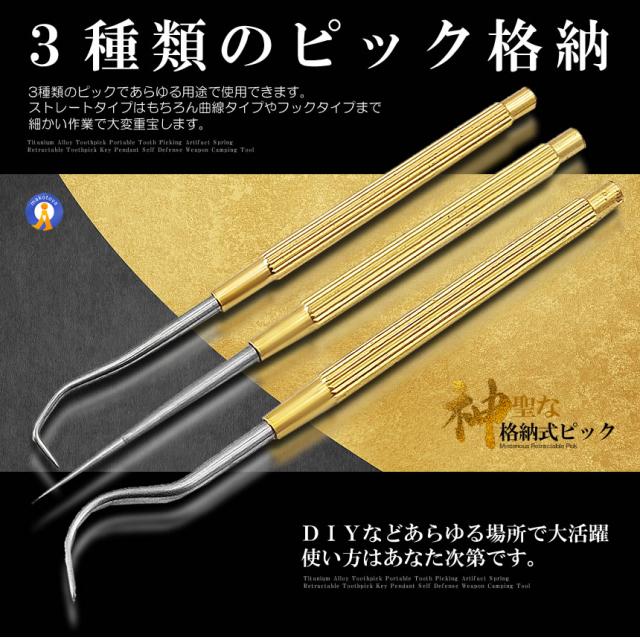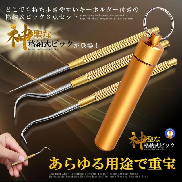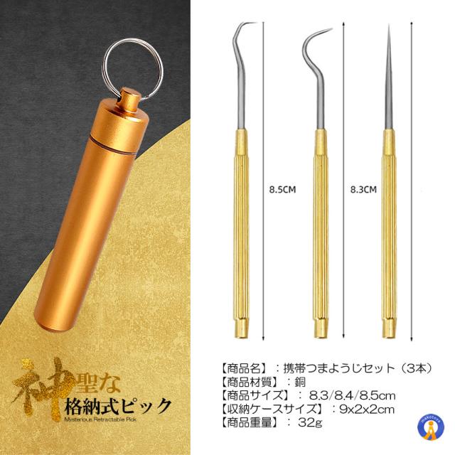 どこでも持ち歩きやすいキーホルダー付きの格納式ピック3点セット「神聖な格納式ピック」が登場!●ボトル式で持ち運び簡単ボトル式&キーホルダー搭載でカバンやベルトに装着できます。もしもの際にかなり便利なピックセットです●3種類のピック格納3種類のピックであらゆる用途で使用できます。ストレートタイプはもちろん曲線タイプやフックタイプまで細かい作業で大変重宝します。●DIYなどあらゆる場所で大活躍使い方はあなた次第です。●高品質な材質ステンレス鋼の爪楊枝とチタン合金ケースは軽量で硬質表面で環境に優しいです。耐腐食性と耐錆性が良好です,【商品名】:携帯つまようじセット(3本)【商品材質】:銅【商品サイズ】: 8.3/8.4/8.5cm【収納ケースサイズ】:9x2x2cm【商品重量】: 32g送料無料