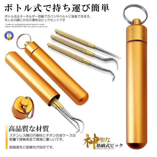 5セット 格納式 ピック セット ステンレス 爪楊枝 ケース 3種類 つまようじ 携帯 キーホルダー GOLDSET