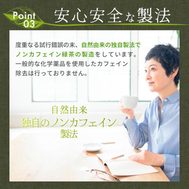 - 緑茶が好きなのですが、寝る前に飲むと寝付きが悪くなるので困っていました。 これからは、ゆっくりお茶を飲んでから眠りにつけます。