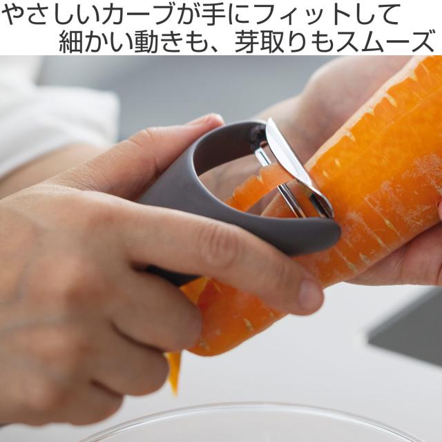 握ると裏側のくぼみに自然と指がかかり、柄全体が手のひらにフィットします。手に馴染むコンパクトな形状は動かしやすくスムーズに皮むきができます。