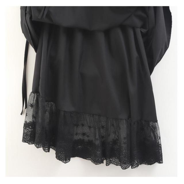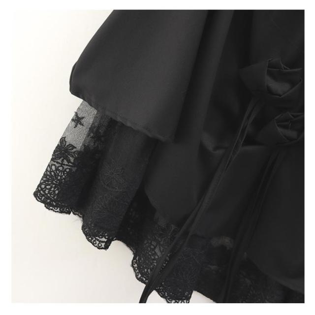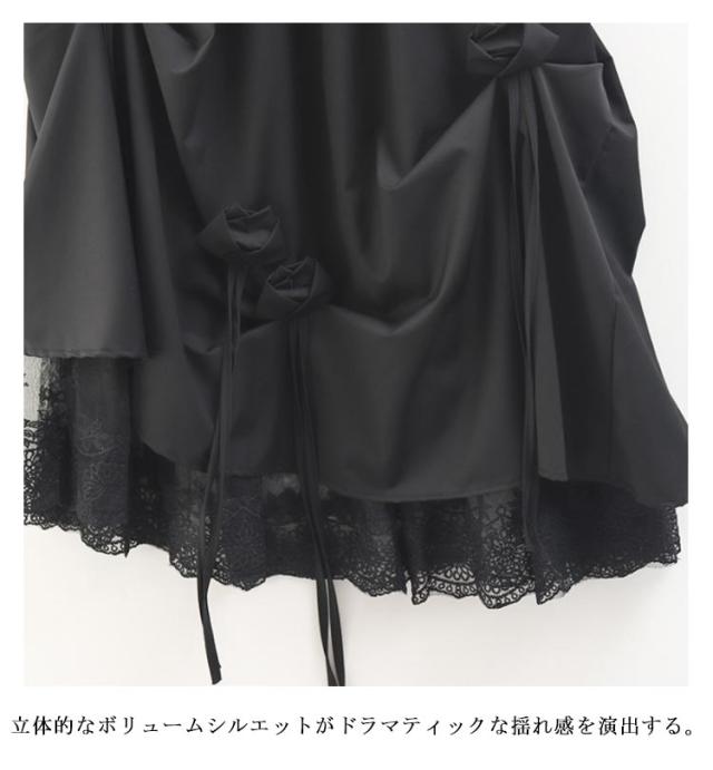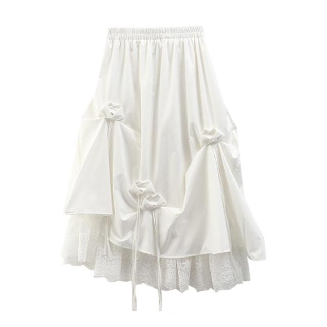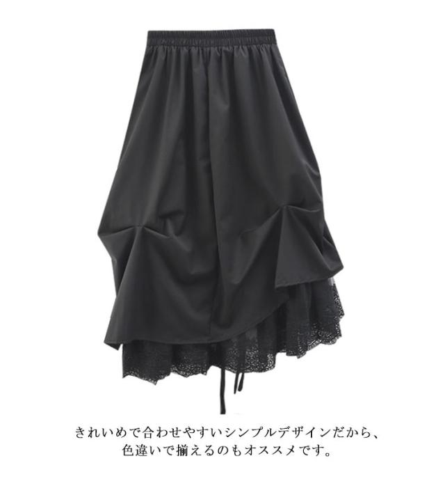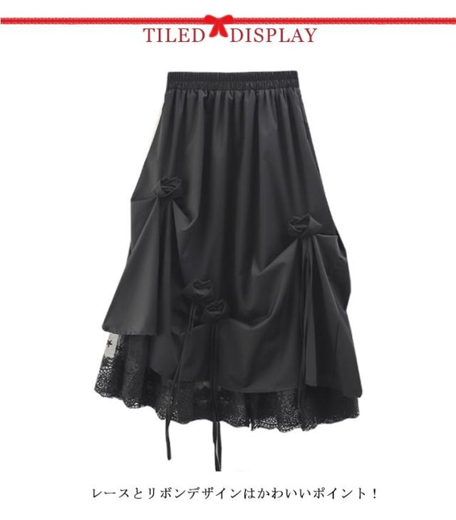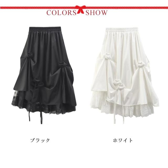 アシンメトリー リボン レース切り替え ロングスカート スカート ウエストゴム きれいめ ボリューム感 スカート カジュアル モード系 ゆったり ロング丈 おしゃれ 原宿系 アシンメトリー 個性的 無地 ホワイト ブラック フリーサイズ 体型カバー ギフト