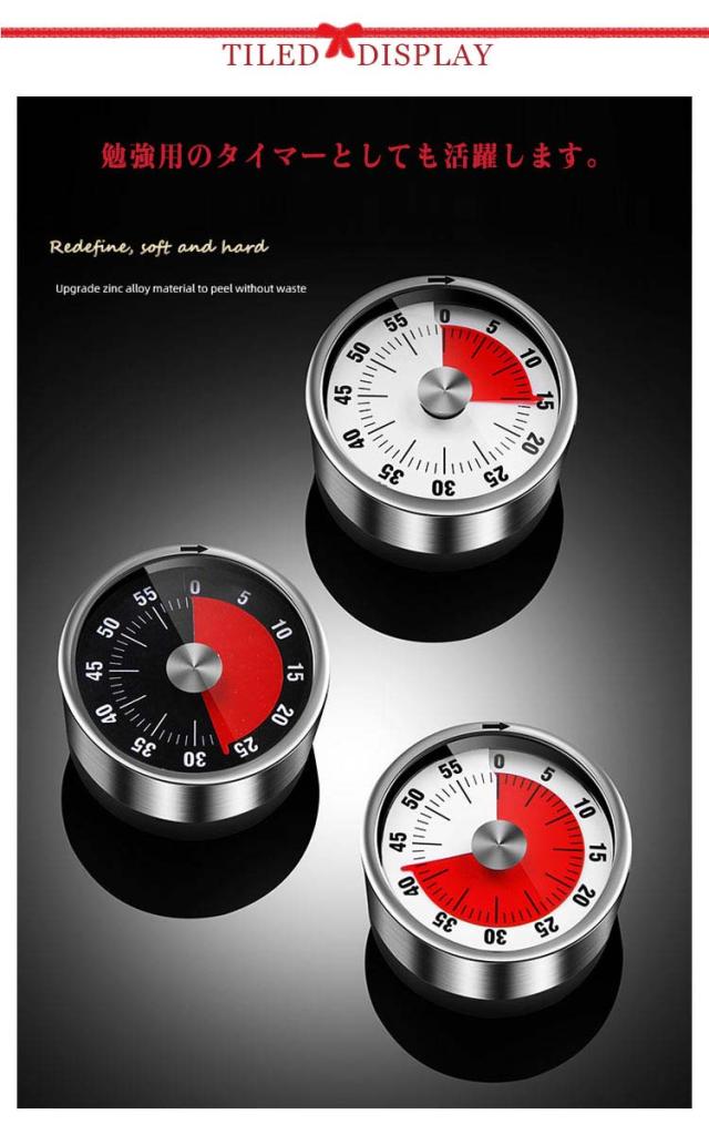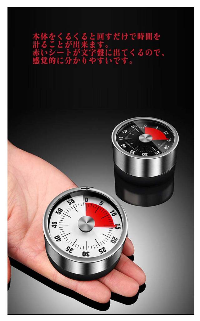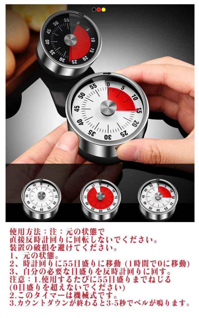 | レトロで可愛いアナログの「機械式タイマー」です。 本体をくるくると回すだけで時間を計ることが出来ます。 赤いシートが文字盤に出てくるので、感覚的に分かりやすいです。 マグネットになっているので冷蔵庫などに貼り付けることが出来ます。 勉強用のタイマーとしても活躍します。 使用方法:注:元の状態で直接反時計回りに回転しないでください。装置の破損を避けてください。 1、元の状態。 2、時計回りに55目盛りに移動 (1時間で0に移動) 3、自分の必要な目盛りを反時計回りに回す。 注意:1.使用するたびに55目盛りまでねじる(0目盛りを超えないでください) 2.このタイマーは機械式です。 3.カウントダウンが終わると3-5秒でベルが鳴ります。 | |