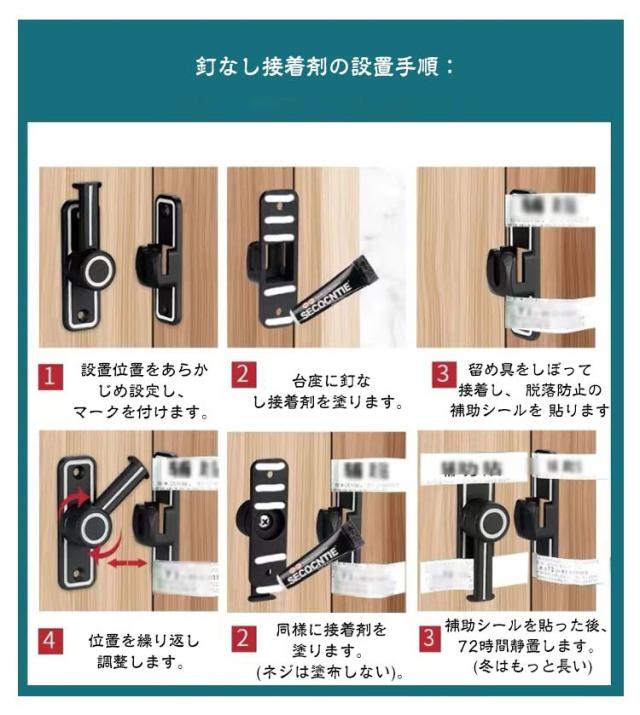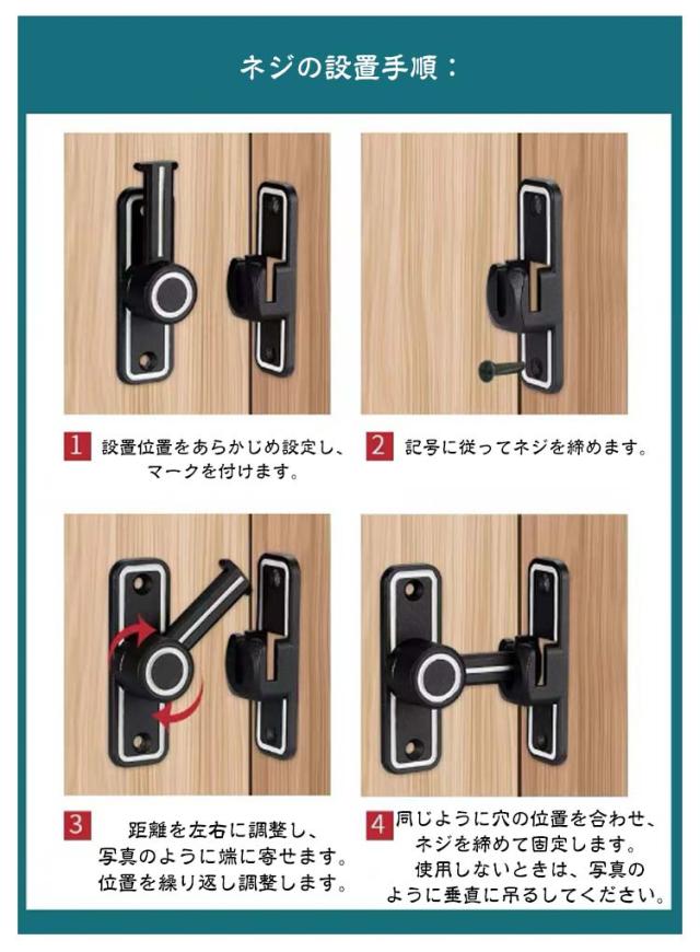 | 【90度・180度2WAY仕様】90度も180度も取り付けられるから、開き戸も引き戸も様々なドアに対応できます。 【高品質素材】高品質な亜鉛合金のドアバックルは、多層研磨仕上げで構成され、厚くて強化されたベース、強度が高く、腐食、錆や変色の心配はありません。簡単に壊れたり変形したりせず、耐久性に優れています。4球軸受構造を採用し、スムーズに回転でき、ワンタッチに簡単に開閉できます。 【便利でシンプル】便利なフリップデザイン、プライバシーロック、フラップは、より快適な生活環境のためにさらなるセキュリティを提供します。 【取り付け簡単】取り付け用のネジが付属しているため、留め具をすぐに設置する事ができます。左または右にインストールすることを選択できます。ドアや窓の安全を確保するために使用できます。 【安全保護】子供ケガ防止だけでなく、部屋の外に出ていかないようにしたり、様々な危険を防止できます。簡単施錠でスライドドアの防犯対策ができます。猫の脱走防止用としてもお使いいただけます。 【幅広い用途】引き戸や部屋のドア、引き出し、バスルーム、オフィス、ホテルなど様々な場所や用途に使えます。 ネジの設置手順: 設置位置をあらかじめ設定し、マークを付けます。 記号に従ってネジを締めます。 距離を左右に調整し、 写真のように端に寄せます。 位置を繰り返し調整します。 同じように穴の位置を合わせ、 ネジを締めて固定します。 使用しないときは、写真のように垂直に吊るしてください。 釘なし接着剤の設置手順: 設置位置をあらかじめ設定し、 マークを付けます。 台座に釘なし接着剤を塗ります。 留め具をしぼって接着し、 脱落防止の補助シールを 貼ります。 位置を繰り返し調整します。 同様に接着剤を塗ります。 (ネジは塗布しない) 補助シールを貼った後、 72時間静置します。 (冬はもっと長い) | |