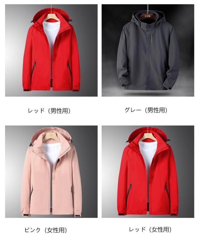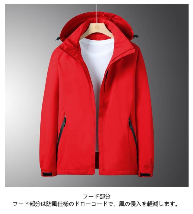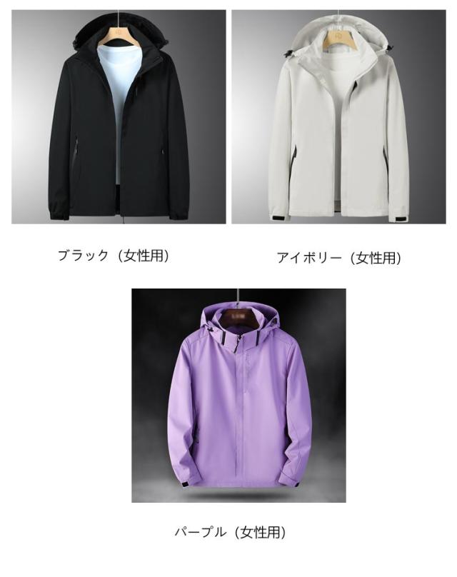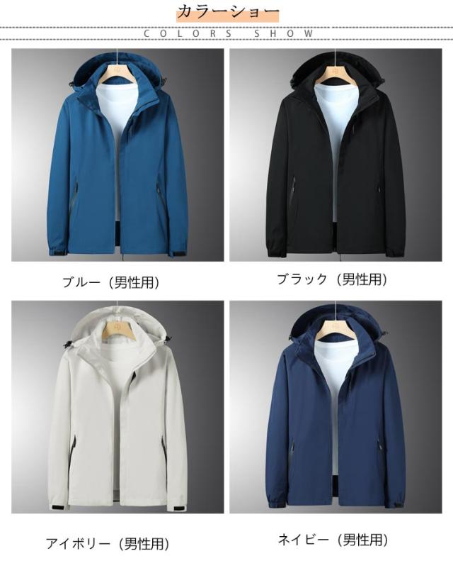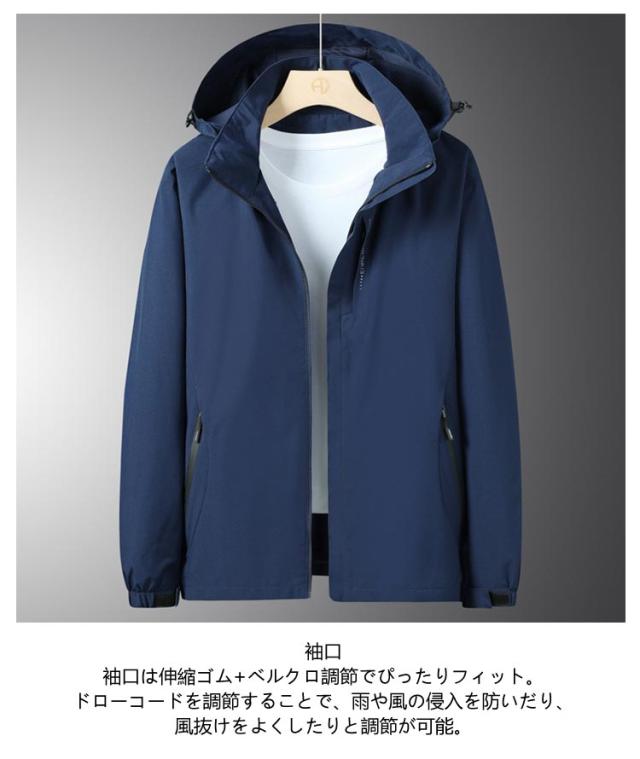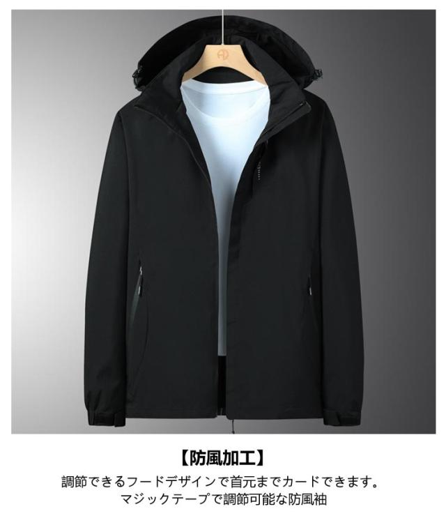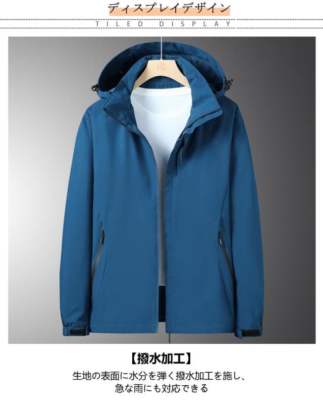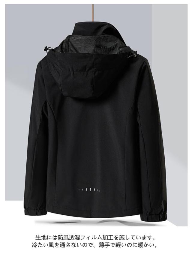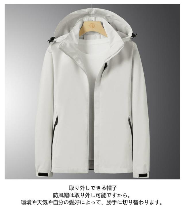 | M-4XL 撥水/透湿/防風 マウンテンパーカー 男性用/女性用 【撥水加工】 生地の表面に水分を弾く撥水加工を施し、急な雨にも対応できる 【防風加工】 ・調節できるフードデザインで首元までカードできます。 ・マジックテープで調節可能な防風袖 生地には防風透湿フィルム加工を施しています。 冷たい風を通さないので、薄手で軽いのに暖かい。 朝晩の気温差の激しい春や秋の体温調整に役立ちます。 バイクや自転車での通勤通学におすすめです。 <お勧めポイント> ●01.取り外しできる帽子 防風帽は取り外し可能ですから。環境や天気や自分の愛好によって、勝手に切り替わります。 ●02.袖口 袖口は伸縮ゴム+ベルクロ調節でぴったりフィット。ドローコードを調節することで、雨や風の侵入を防いだり、風抜けをよくしたりと調節が可能。 ●03.フード部分 フード部分は防風仕様のドローコードで、風の侵入を軽減します。 ●04.ポケットは左右に2カ所。 正面左右にファスナー付きポケット。スマホや鍵を落とさず安心。 | |