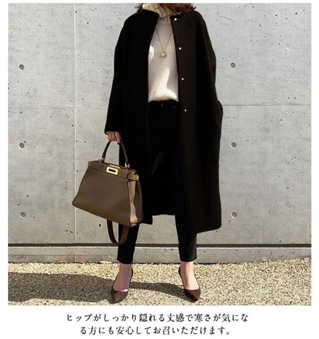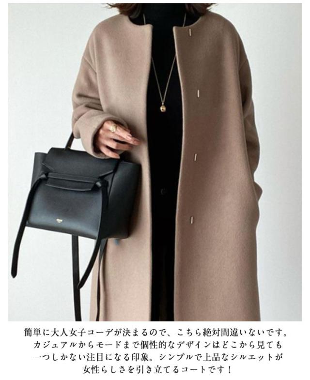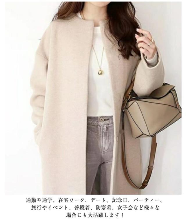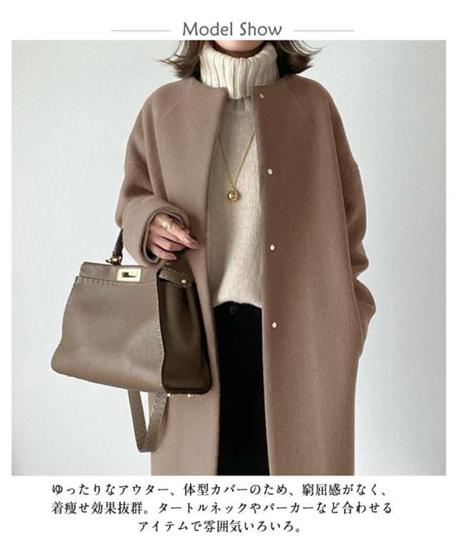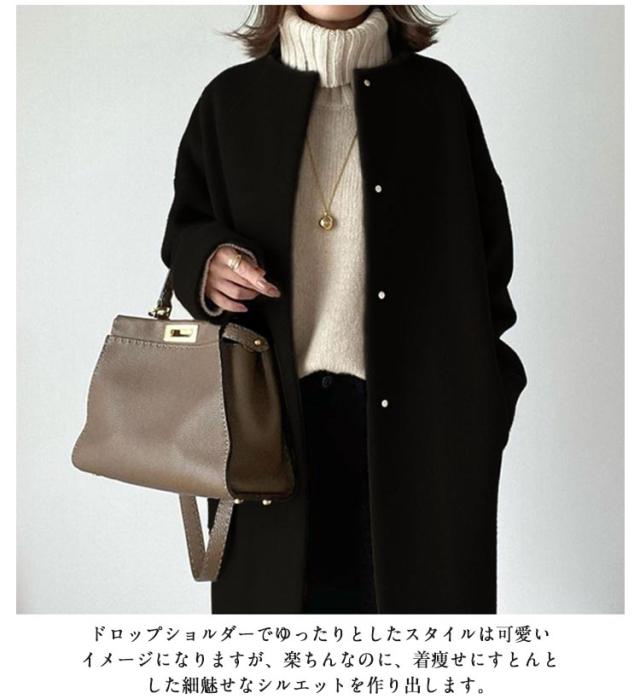 | ちょうどいい丈感で合わせやすいカジュアルコートの登場です!フォーマルからカジュアルまでコーディネート自由なシンプルデザインが魅力です。 ゆったりなアウター、体型カバーのため、窮屈感がなく、着痩せ効果抜群。タートルネックやパーカーなど合わせるアイテムで雰囲気いろいろ。 秋冬の冬服コートはもちろん春先としてのコートとしてもロングシーズン着用できます。エレガントで大人な雰囲気を演出してくれるチェスターコート風コートです。 高級感漂う立体的なシルエットのノーカラーコート。丸みのあるラインが綺麗なノーカラーデザインは、女性らしさを演出しながらもすっきりした印象に。 ドロップショルダーでゆったりとしたスタイルは可愛いイメージになりますが、楽ちんなのに、着痩せにすとんとした細魅せなシルエットを作り出します。ヒップがしっかり隠れる丈感で寒さが気になる方にも安心してお召いただけます。 通勤や通学、在宅ワーク、デート、記念日、パーティー、旅行やイベント、普段着、防寒着、女子会など様々な場合にも大活躍します! 簡単に大人女子コーデが決まるので、こちら絶対間違いないです。カジュアルからモードまで個性的なデザインはどこから見ても一つしかない注目になる印象。シンプルで上品なシルエットが女性らしさを引き立てるコートです! | |
