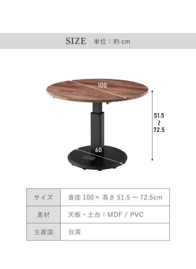 丸型昇降テーブル 直径100cm 高さ調節可能 昇降テーブル ガス圧シリンダー ダイニングテーブル 丸テーブル ダイニング カフェテーブル 円形 テーブル ラウンド 円卓 おしゃれ 北欧(代引不可)