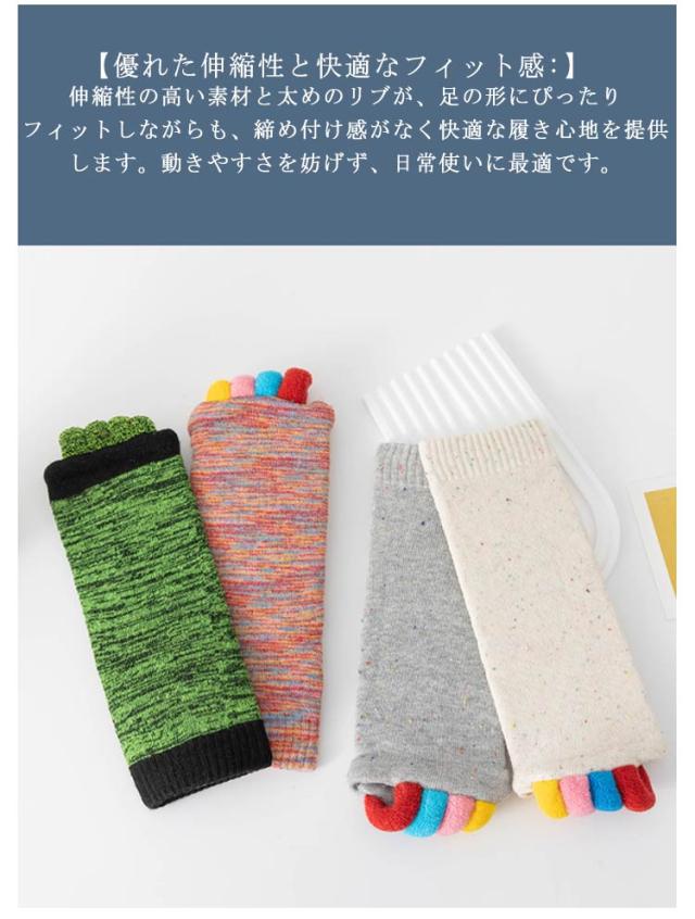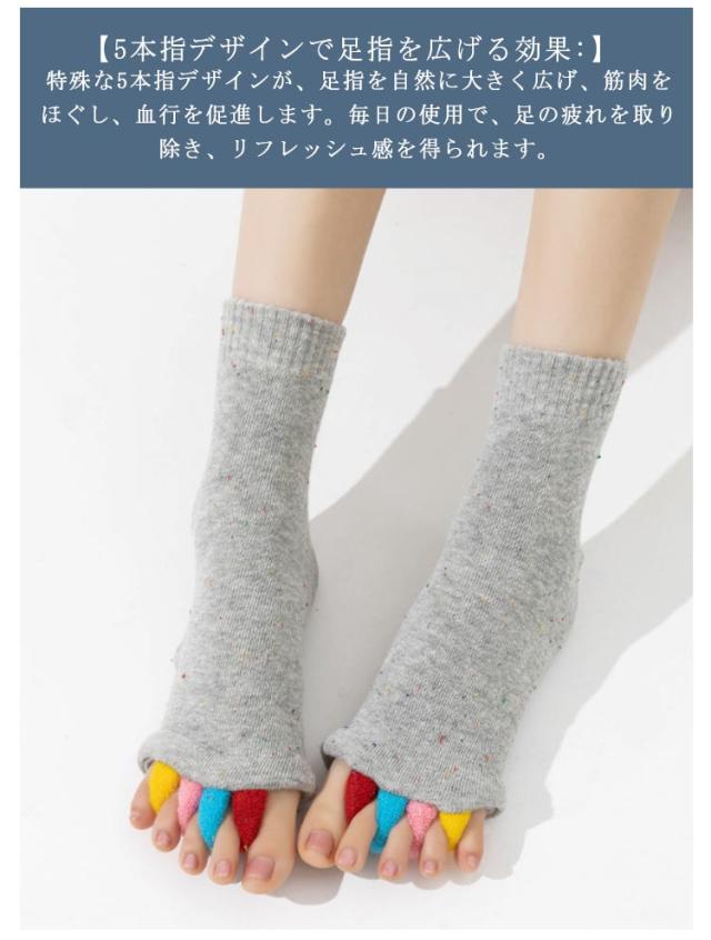 | 【5本指デザインで足指を広げる効果:】 特殊な5本指デザインが、足指を自然に大きく広げ、筋肉をほぐし、血行を促進します。毎日の使用で、足の疲れを取り除き、リフレッシュ感を得られます。【外反母趾の予防と矯正に効果的: 】足指を個別にサポートすることで、外反母趾の進行を抑え、矯正効果が期待できます。自然な形で足指を広げるので、無理なく足の形を整えます。 【マッサージ効果でリラクゼーション: 】足指の間隔を広げることで、足裏のツボを刺激し、軽いマッサージ効果を発揮。日中の疲れやストレスを軽減し、心身ともにリラックスできます。 【高い通気性と柔らかな素材: 】ふわふわのパイル生地を使用しており、長時間履いても蒸れにくく、快適な着用感を維持。通気性が高く、汗をかきやすい方にもおすすめです。 【優れた伸縮性と快適なフィット感:】 伸縮性の高い素材と太めのリブが、足の形にぴったりフィットしながらも、締め付け感がなく快適な履き心地を提供します。動きやすさを妨げず、日常使いに最適です。 【冷え取り効果で快眠サポート: 】足元を温かく保ち、の改善に役立ちます。特に寒い季節の夜間には、足元をしっかり温め、快適な眠りへと導いてくれます。 | |