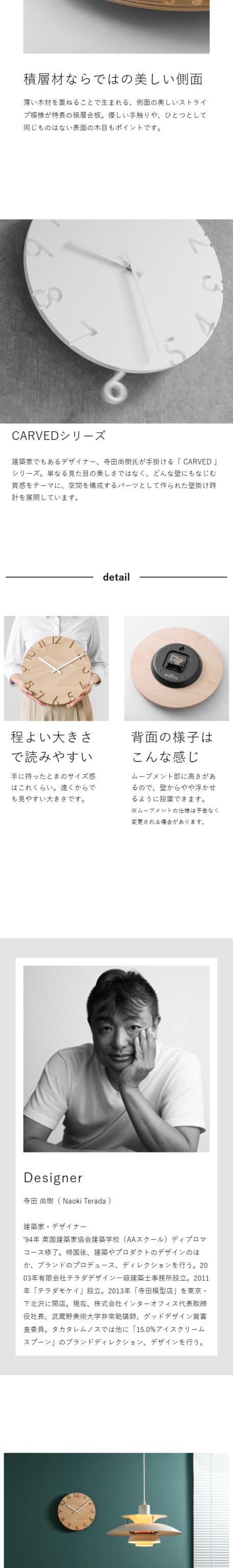 建築家の寺田尚樹氏が手がけるカーヴドシリーズ直径30.5cmの時計。木目が美しい白樺の積層材に彫り込まれた数字のインデックス、白い針が映えるミニマルなデザインはリビングにおすすめ。