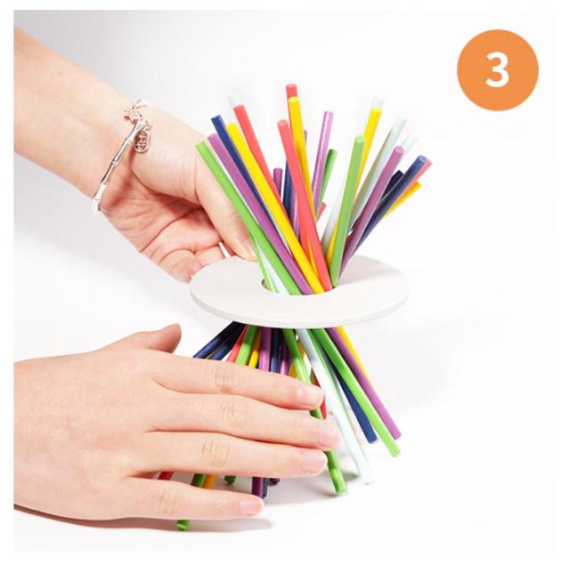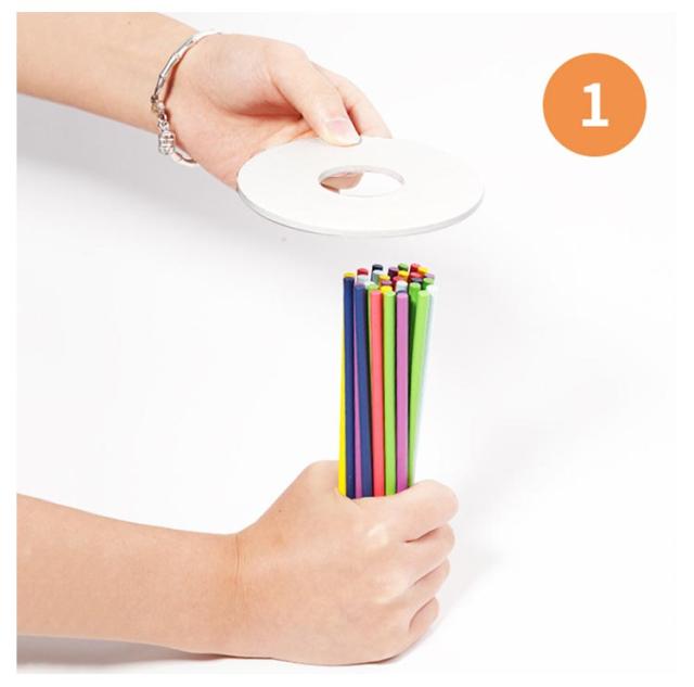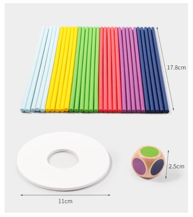 | サイズについての説明 | 32点セット:スティッキー30本、リング1個、サイコロ1個。 遊び方の説明 1、全てのスティックを束にして片手で握ってください。 2、木の輪を束の上から通して真ん中まで下ろし、ゆっくりと束から手を離して下さい。 3、全体が動かなくなったら、ゲーム準備が完了です。 4、プレーヤは順番にサイコロを投げて下さい。 5、全体が崩さないように注意しながら出たサイコロの色のステイックを取り出して下さい。 6、全体が崩したら(または、スティックが3本しか残らなかった場合)ゲームは終了します。全員は自分の得点を計算し、最も得点が高い人は勝ちです。 |