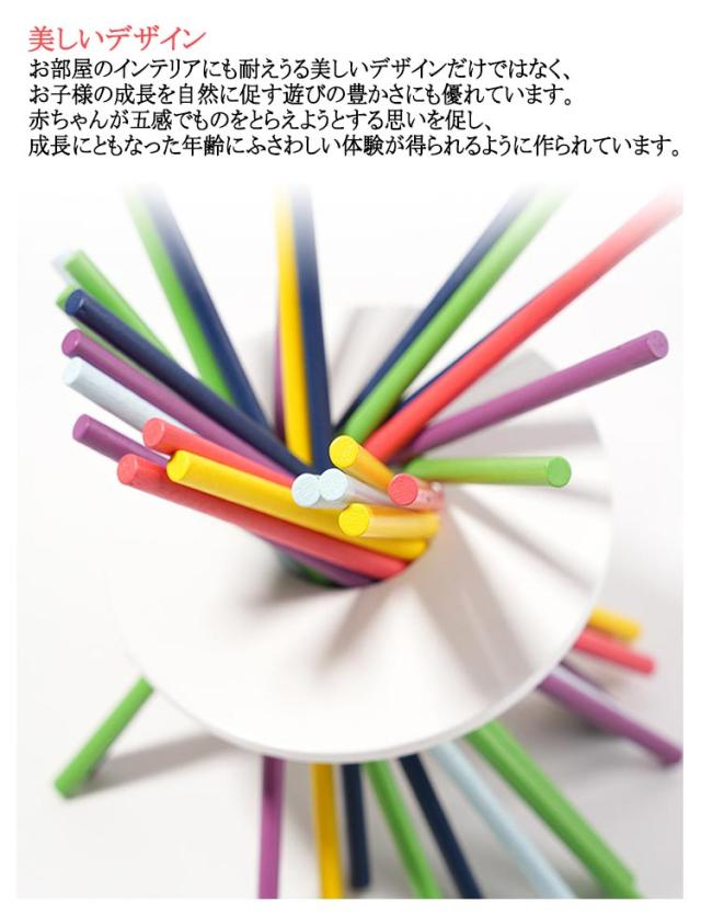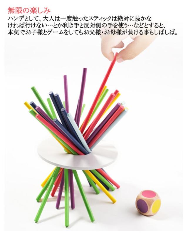 | 子供から大人まで幅広い年齢層から親しまれているボードゲーム!一緒に楽しめる! スティッキーは、6色のたくさんの棒で支えられた柱を崩さないようにしながら、サイコロで示された色の棒を一本ずつ抜いて得点を競うゲームです。テーブルの上で行うと、つるつる滑るので難易度を下げる時には布やコルクを敷くと、崩れにくくなります。 無限の楽しみ ハンデとして、大人は一度触ったスティックは絶対に抜かなければ行けない…とか利き手と反対側の手を使う…などとすると、本気でお子様とゲームをしてもお父様・お母様が負ける事もしばしば。 美しいデザイン お部屋のインテリアにも耐えうる美しいデザインだけではなく、お子様の成長を自然に促す遊びの豊かさにも優れています。赤ちゃんが五感でものをとらえようとする思いを促し、成長にともなった年齢にふさわしい体験が得られるように作られています。 色彩の楽しさ 製品に色彩の楽しさを添えるために、溶剤を含まず自然に優しい水溶性ラッカーだけを使用しています。何層にも塗装を繰り返すことで強い塗膜ができあがり、使用による衝撃や水分による損傷を防ぎます。 大人も子供も楽しめる 小さなお子様からご高齢の方までみんなで遊べるバランスゲーム『スティッキー』です。ルールが簡単なので幅広い方にお楽しみいただけます。お誕生日会やパーティー等でとっても盛り上がります。ご家族やお友達みんなで楽しく遊びましょう。 | |