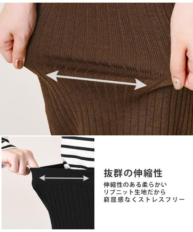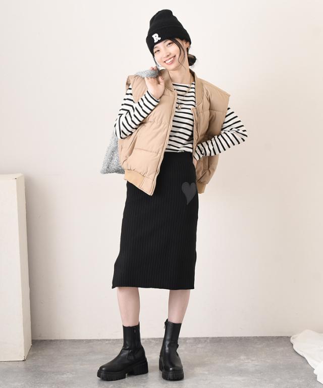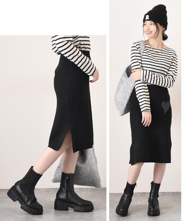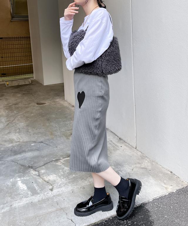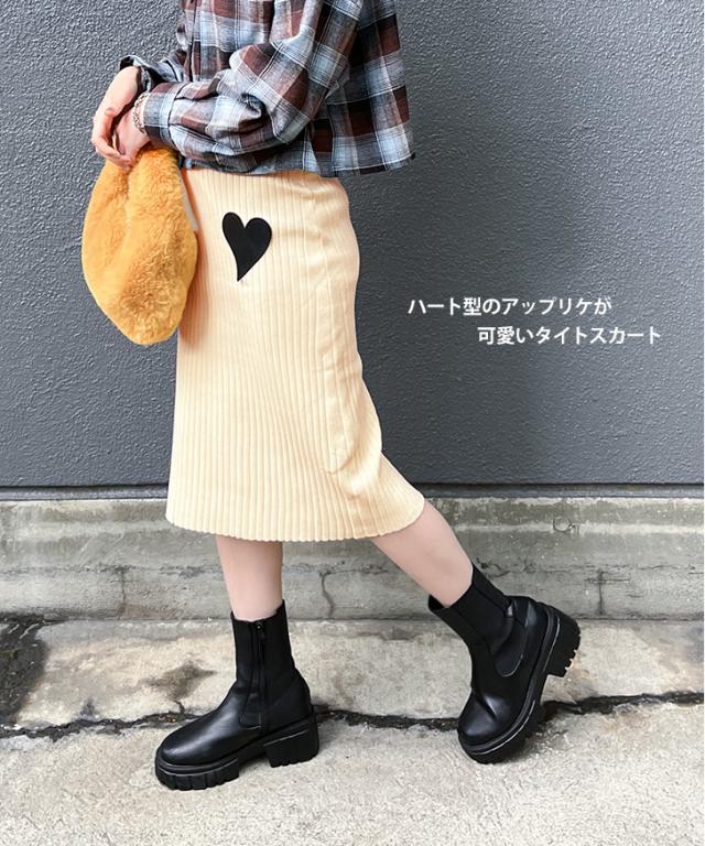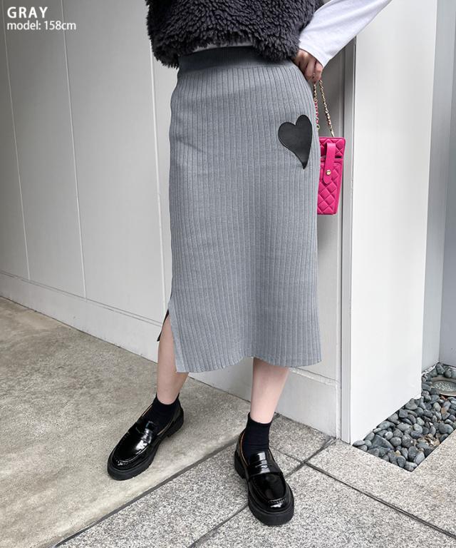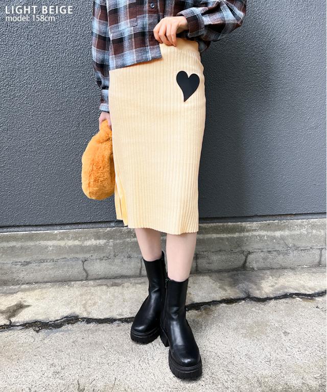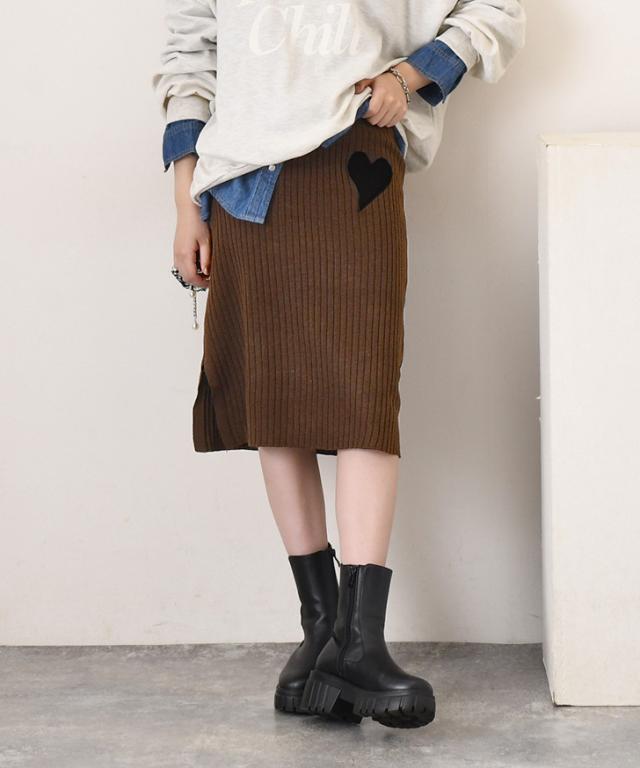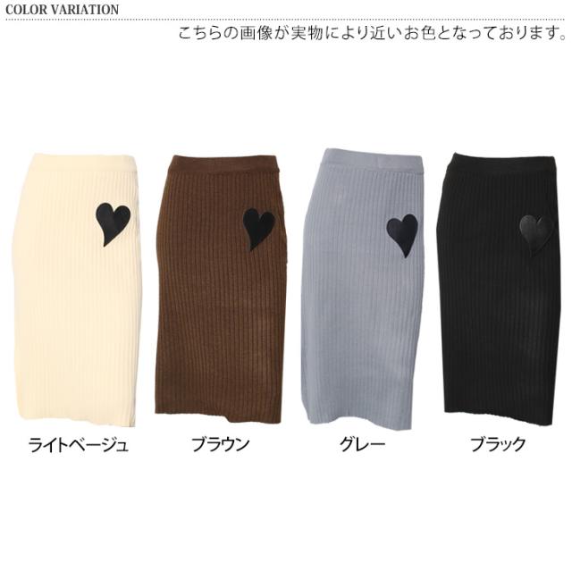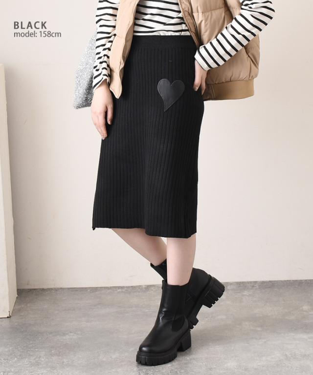 新作 ハートアップリケミディ丈リブニットタイトスカート レディース ボトムス ニットスカート ひざ下 膝下 秋 冬 ミモレ丈 暖かい あったか 防寒 ストレッチ オフィス かわいい 美脚 ウエストゴム 洗える 脚長