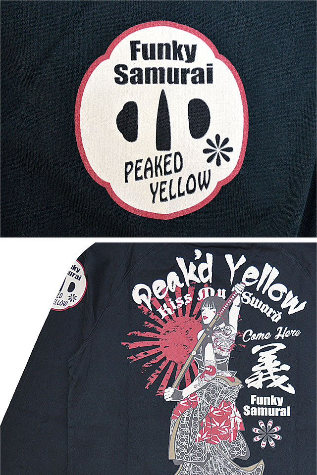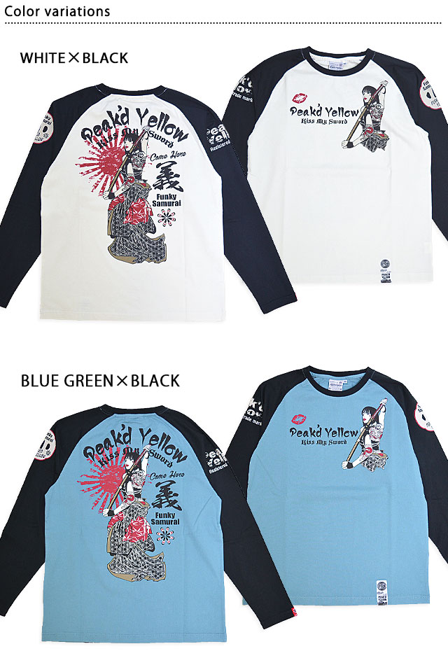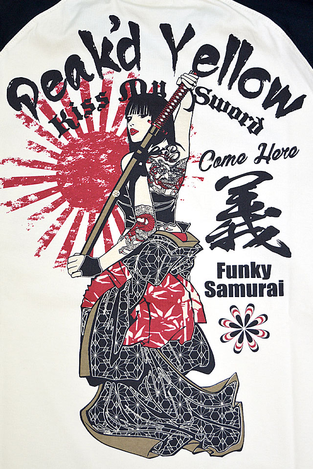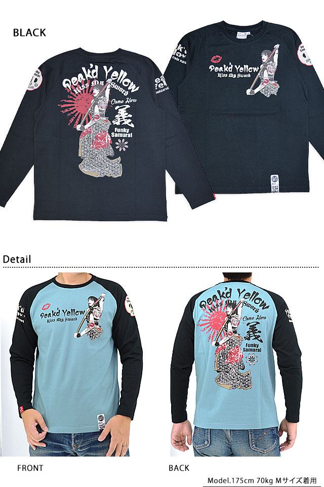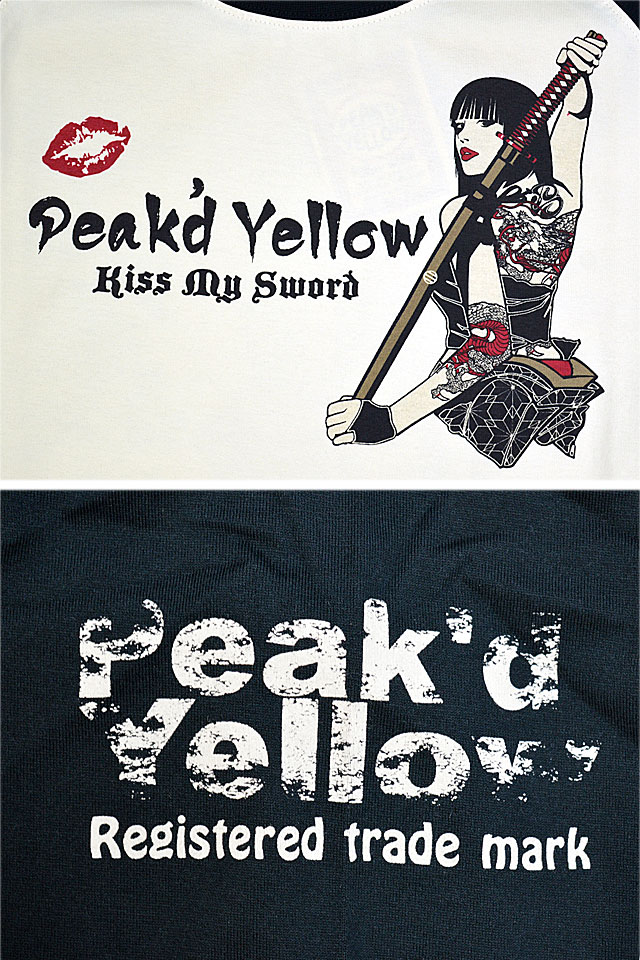 「トンガった日本人」をブランドネーミングに掲げ、オリエンタルビューティーの世界観を作品に封じ込めるピークドイエローから「KISS MY SWORDロングTシャツ(PYLT-242)」のご紹介です! 肩に切り替えの入ったラグランスリーブをボディーに採用した、スポーティーな長袖Tシャツです。 刀を背負って見返る姉御の姿を、フロントバック共にダイナミックに落とし込みました。 左袖にはワッペン風モチーフを、右袖にはブランドロゴをそれぞれプリントしました。 生地には綿100%の、よれにくいタフなものを採用。 | ||||||||||||||||||||