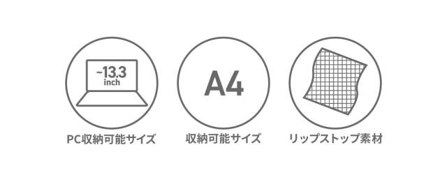 | 仕様 | <外側> ジップポケット(M)×1 メッシュポケット(S)×1 ポケット(S)×1 <内側> PC収納×1 |