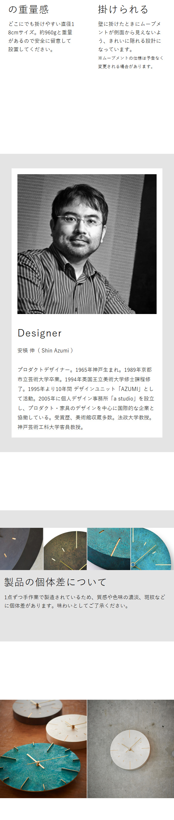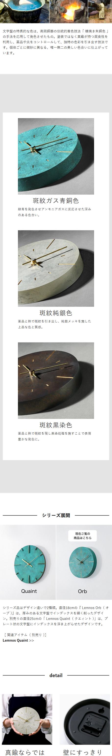 重厚感あふれる伝統技術が生み出した風合い 航海や天体観測の古く錆びた計器に着想を得た、真鍮製ウォールクロック『 Lemnos オーブ 』。文字盤の特徴ある彩色は、加賀藩に起源を持つ高岡銅器の伝統技法を元にもたらされたもの。コンクリート壁やレンガ壁など、素材が強い内装にも存在感を放つ佇まいです。直径18cmの小ぶりなサイズで、リビングやダイニングに飾るほか、秒針がなく比較的静かなので寝室にもおすすめ。真鍮と着色部分のコントラストが鮮やかな、伝統工芸の美しさが際立つ壁掛け時計です。